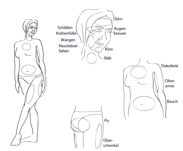 - Bauch, Po, Oberschenkel, Intimbereich (Vaginalstraffung bei Frauen)