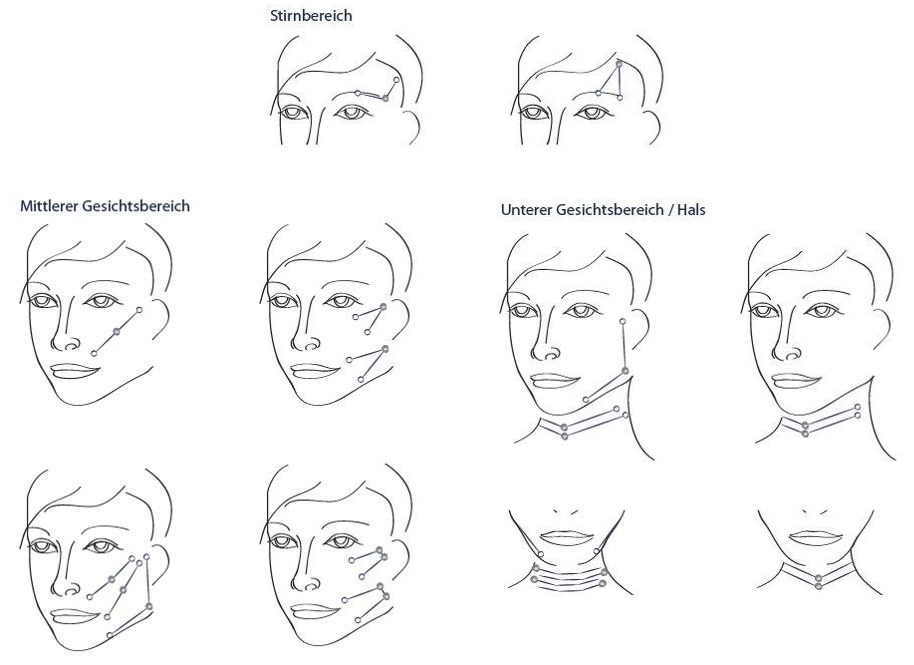 Je nach Gesicht und Wunsch werden die Zugrichtung und Positionierung der Fäden geplant und Markierungen in aufrechter Position angebracht. Nach Desinfektion, lokaler Anästhesie der Eintrittspunkte und steriler Gesichtsabdeckung werden die Fäden über Führungskatheter in Rückenlage unmittelbar unter der Haut positioniert.